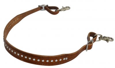 1.25" wide leather wither strap with crystal studs. Easily attach to breast collar rings with scissor snaps on both ends and adjusts with conway buckles 30" - 32".